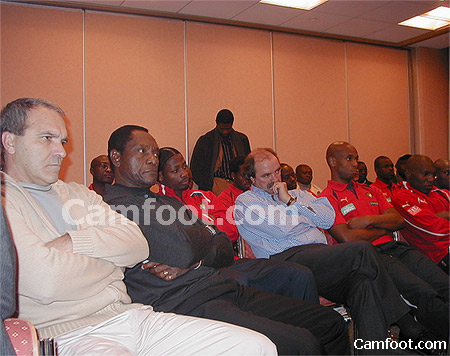 Les joueurs vont se rafraîchir… Le président IYA et son vice-président Mayebi attendent le ministre qui est annoncé, et qui finit par arriver vers 18h50 (apparemment, il s’était un peu perdu en route). En compagnie du Directeur des Sports, Ndzana Robert, Mr Mbarga Mboa se fait un plaisir de rencontrer le directeur du journal Al Mountakhab, Mr Mostafa Badri. Cette parution marocaine a récemment élu Samuel Eto’o « Lion d’Or » africain 2004. Mr Badri a demandé la permission au ministre, très honoré par la distinction, de remettre son trophée au barcelonais lors du match Cameroun-Soudan du 26 mars prochain. La Fécafoot réglera les modalités pratiques de cette remise.