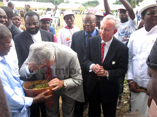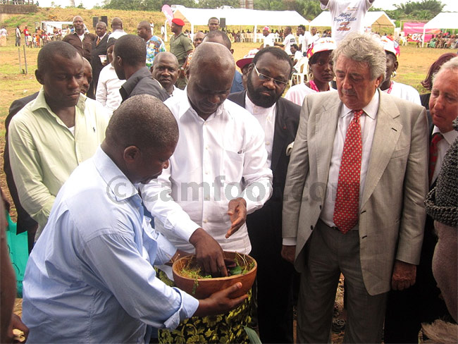 Les allocutions terminées, les chefs traditionnels Bakoko présents ont convié Roger Milla et ses partenaires canadiens à des rituels traditionnels. La symbolique de ce geste est la présentation de l’initiative aux ancêtres afin qu’ils puissent l’accompagner de la première pierre à la construction de cet édifice. Ce pacte des vivants avec les ancêtres, s’est déroulé au lieu affrété pour la première pierre. On pouvait observer pendant ce rite une calebasse qui contenait de l’eau dans laquelle baignaient des herbes, avec au fond des œufs. Comme pour matérialiser un engagement devant les vivants et les morts, le vieux lion après avoir exprimé son intention de voir éclore ce complexe s’est lavé les mains, ensuite le visage dans le contenu de la calebasse avant d’achever le rituel en brisant un œuf au pied du monument. Il sera suivi dans sa démarche sous recommandation des chefs traditionnels Bakako par ses partenaires canadiens. Hésitant au départ, ces derniers se sont finalement mouillés et emboîter le pas de Roger Milla. Les futurs bâtisseurs se sont donc prêtés au jeu, au grand plaisir du public et de la population locale.