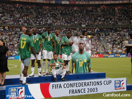 Cette équipe a débuté le tournoi, qui avait lieu en France, par une victoire prestigieuse sur le Brésil 1-0. Ronaldinho et Adriano n’avaient pas pu résister aux arrêts d’un Kameni en état de grâce, ni à la demi volée de Samuel Etoo fils qui crucifiait le portier Dida. Les Lions terminaient le tournoi en finale par une défaite aux prolongations contre le pays hôte, grâce au but en or de Thierry Henry.