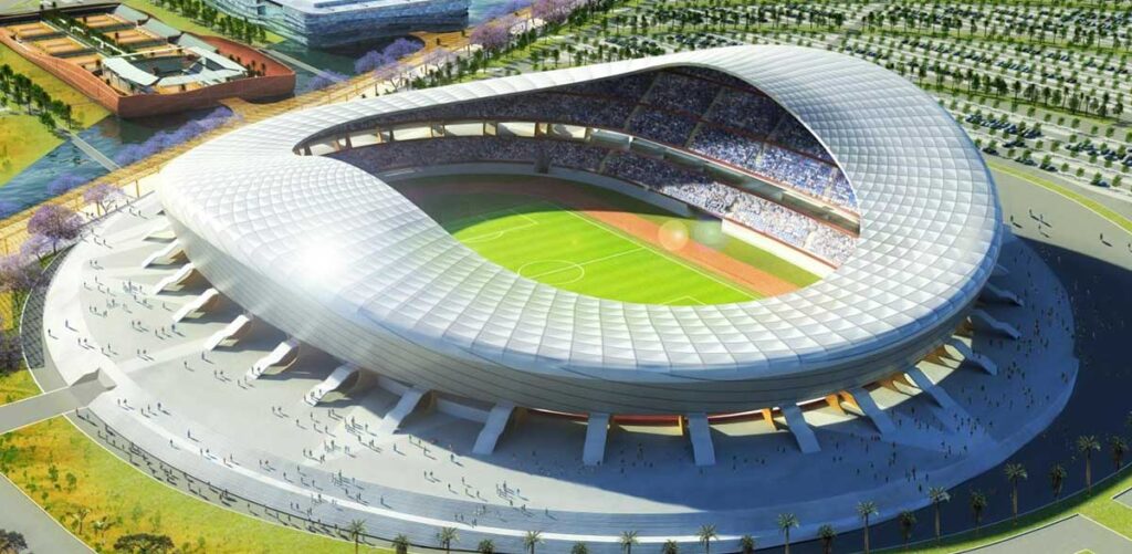 – 4 vestiaires, 16 guérites d’entrée, 4 mats d’éclairage de 200 projecteurs chacun