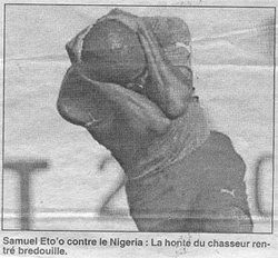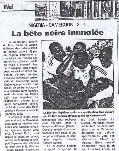 Ainsi donc « WALFADJIRI », célèbre quotidien de la place dans son édition du 9 février 2004 No 3570 sous-titrait : NIGERIA 2 CAMEROUN 1. LA BETE NOIRE IMMOLEE. Sur ses colonnes on pouvait lire je cite: « … malgré les tentatives d’Eto’o et du remuant Ndieffi entré à la place de Mboma, le Cameroun ne pouvait que capituler. Le nigeria battu 3 fois en finale de la Can (1984 1988 2000) par le Cameroun pouvait savourer une douce revanche.