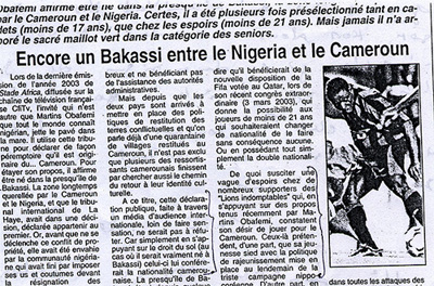 Ce même journal quelques semaines auparavant et ce dans son édition du 14 janvier 2004 No 3549, enfonçait le clou dans le différend qui oppose le Cameroun au Nigeria sur la célèbre presqu’île Bakassi, en sous-titrant: « OBAFEMI MARTINS ENCORE UN BAKASSI ENTRE LE NIGERIA ET LE CAMEROUN. » On pouvait lire sur ses colonnes: « lors de la dernière émission de l’année 2003 sur CFI TV, OBAFEMI MARTINS que tout le monde connait Nigérian, jette le pavé sur la marre en affirmant de façon préremptoir qu’il est originaire du Cameroun. Il affirme être né dans la presqu’ île de Bakassi… A ce titre, cette déclaration publique faite à travers un média d’audience internationale, loin de faire sensation, ne serait pas à réfuter. Car seulement en s’appuyant sur le droit du sol au cas où il serait vraiment né à Bakassi, celui-ci lui conférerait la nationalité Camerounaise… De quoi susciter une vague d’espoir chez les nombreux supporteurs des LIONS Indomptables qui en s’appuyant sur des propos récemment tenus par Martins, constatent son désir de jouer pour le Cameroun. Ceux là prétendent d’une part que sa jeunesse sied bien avec la politique de rajeunissement mise en place au lendemain de la triste campagne Nippone…. Il est évident que pour les observateurs avertis, il formerait un tandem de choc avec Eto’o dont on dit avoir des qualités complémentaires…. On connaît la suite, avec le refus de Martins de répondre à l’appel de Jean-Paul AKONO qui réclamait ses services dans la formation espoir du Cameroun.