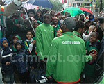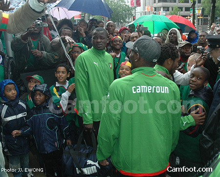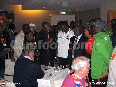 Au fait, et notre fan club ? Après un petit tour dans le hall de l’hôtel, je vois que Rigobert Song a accepté poser avec le Fan Club qui, toujours retenu de l’autre côté de la porte, aura quand même eu son lot de consolation. Tu es vraiment notre Magnan national. Sans lui, ils allaient dirent qu’ils connaissent qui chez les lions pour se faire de nouveaux clients à 30 euros ? Et même qu’ils ont eu des sponsors qui ont financé le voyage rien qu’à la seule vue du nom de notre Eto’o national qui adore décidément le micro. De retour sur Bruxelles, j’ai du masser mon ventre avec des glaçons … vous comprenez que mangez pour tous les mécontents n’a pas été chose facile. Heureusement que Dieu nourrit les oiseaux. En passant, ils disent que le prochain stage des lions se déroulera en août. Si c’est vrai, même à pied, je viendrais manger la « nourriture » d’Orange en espérant que la bagarre soit éternelle.