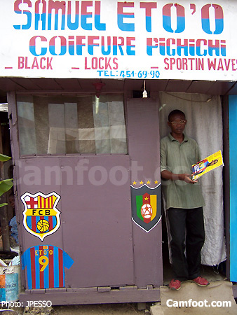 10h30, mercredi. Le propriétaire du salon de coiffure « Pichichi », KOUOH Samuel n’est pas dans son local, qui est ouvert, mais vide. De retour une heure après, il nous parle du nom de son business: »j’ai décidé de donner le nom du Pichichi à mon salon de coiffure parce que Samuel Eto’o est d’abord mon frère camerounais, et puis j’aime sa façon de jouer. Il fait beaucoup pour les camerounais, en faisant rêver les jeunes comme nous autres… » Samuel Kouoh a ouvert ce salon il y a quatre ans, et l’a rebaptisé ainsi depuis un match d’anthologie (dont il ne se souvient ni de la date ni de l’adversaire) de son homonyme l’an dernier. Dépité depuis la blessure du numéro 9, il affirme tout de même « regarder les matches du Barça » même si « depuis, le club est en baisse! Sans Eto’o, le Barça n’est rien! »