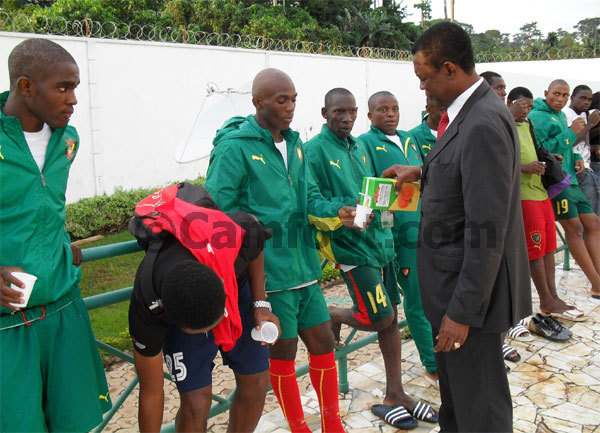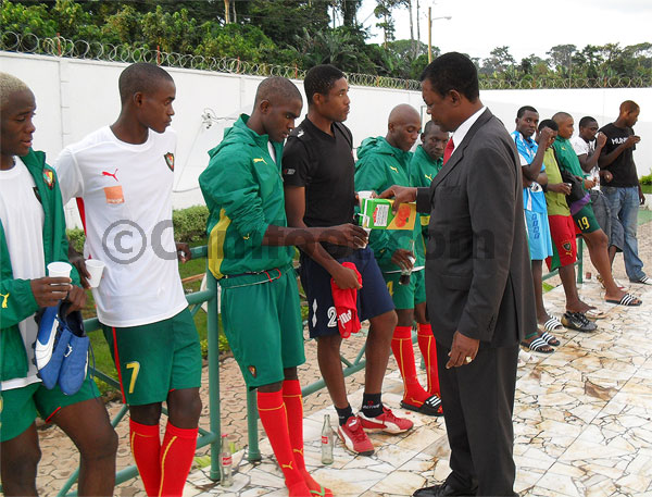 Ndomo Sabo se faisant servir par l’ex ministre des Mines, M. Salé, venu encourager les Lionceaux