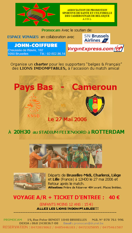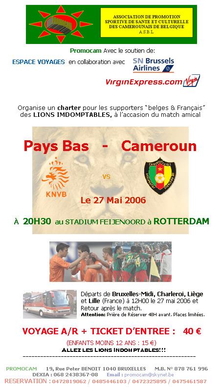 transport des supporters des Lions indomptables résidents en Belgique et le nord de la France, qui voudraient aller à Rotterdam le 27 mai pour le match amical entre le Cameroun et les Pays-Bas.