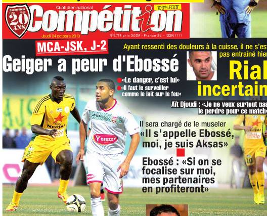 Dans la presse spécialisée, la rencontre est très attendue et les pics et messages par médias interposés ne manquent pas. Il y aura notamment le grand duel entre le défenseur du MCA (Aksas) et l’attaquant de la JSK (Ebosse). Il faut rappeler que le Mouloudia Club d’Alger est une équipe difficile à jouer à domicile. Ce club fondé en 1921 est considéré comme le doyen des clubs algériens. Le MC Alger est aussi le deuxième club le plus titré au pays. Hier, en levée de rideau, la JSM Béjaïa a été tenue en échec par le MO Béjaïa (0-0). La suite de la 9e journée ce Samedi. Calvin AmougouLe portrait d’Albert Ebossé