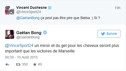 Via Twitter, Gaëtan Bong a réagi à l’arrivée imminente du double champion de Grèce, souhaitant « du courage aux Marseillais si Michel est nommé coach ». Relancé à ce sujet par un journaliste du LeFigaro/Sport24.com, l’arrière gauche a enfoncé le clou: «Un miroir et du gel pour les cheveux seront plus important que les victoires de Marseille.»