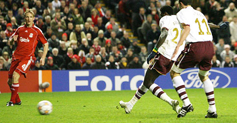 Arsenal (sans Alexandre Song resté sur le banc de touche) a mis la pression d’entrée sur le but de Pepe Reina et, comme à l’aller (1-1), les Londoniens ouvraient le score dans la première demi-heure. A la 13e minute, Abou Diaby arrivait lancé dans la surface par Aleksandr Hleb et trompait Reina d’un tir puissant à angle fermé. Mais comme à l’aller, Liverpool répliquait sans attendre. Sur un corner de Steven Gerrard, le défenseur liverpuldien Sami Hyypiä s’élevait au deuxième poteau et plaçait une tête de 15 m qui heurtait le poteau de Manuel Almunia avant de remettre les deux formations à égalité sur l’ensemble des deux matches.