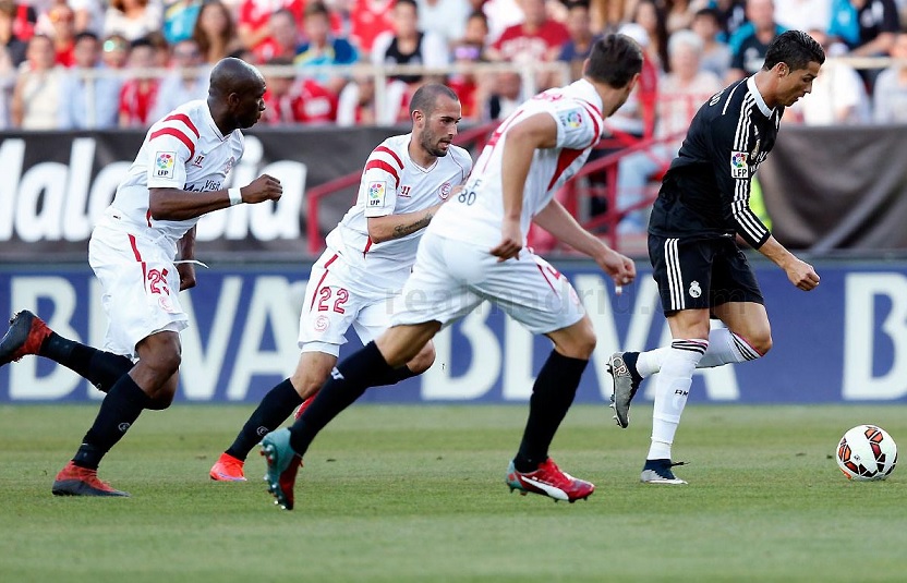A Séville, Stéphane Mbia et ses coéquipiers ont failli de peu barrer la route de la victoire au Real Madrid. Mais c’était sans compter sur un Cristiano Ronaldo déterminé à ne pas se laisser prendre par Lionel Messi au classement des meilleurs buteurs du championnat cette saison. Auteur d’un triplé dans le succès de la Maison Blanche 3-2 lors de cette rencontre, l’attaquant portugais porte son compteur à 42 buts en Liga, deux longueurs de plus que l’argentin Lionel Messi (40 buts). Le FC Séville s’est pourtant bien défendu avec un Stéphane Mbia omniprésent à (presque) tous les postes de champ. Solide dans les duels, le milieu de terrain camerounais a beaucoup aidé ses partenaires aussi bien en défense et dans l’entrejeu comme en attaque. Son engagement physique et sa détermination n’ont malheureusement rien donné face au réalisme de Cristiano Ronaldo.
