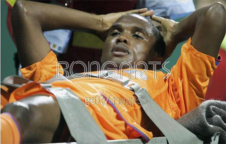 1. Eto'o évacué après sa blessure au Weserstadion de Brême