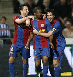 Rijkaard a été bien affûté de laisser de côté le 3-4-3- qu’il utilisait depuis quelques rencontres pour revenir au classique 4-3-3. Trois minutes seulement après le début de la rencontre, le premier but allait arriver de la patte droite de Samuel Eto’o d’une frappe limpide et travaillée.