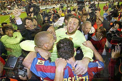 L’équipe encadrée par le hollandais Frank Rijkaard a commencé à célébrer son titre de Champion d’Espagne alors les joueurs se trouvaient dans les vestiaires pour la pause de la première mi-temps.