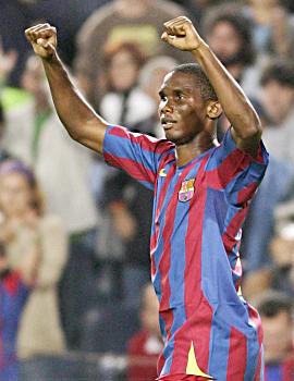 Samuel Eto’o grabbed the headlines this week in European Champions League play as his club Barcelona advanced to the next round of the Champions League with two matches still to play in the group stage. Eto’o started at forward for Barcelona as they defeated Panathinaikos of Greece 5-0. Eto’o scored his first goal in the 14th minute of the game as he was left unmarked and headed in a left wing cross into the upper right corner of the goal. In the 40th minute the Cameroonian marksman notched his second goal after teenage sensation Lionel