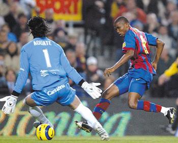 Barcelona maintained their 7 point lead atop Spain’s La Liga with a 3-0 victory over Racing Santander. Samuel Eto’o started at forward and got Barcelona off to a good start by scoring in the 8th minute of the match. Midfielder Xavi placed a perfect through ball and Eto’o beat the Racing offside trap to come in alone against Racing’s goalie on the right side of the penalty area, Cameroon’s star shot between the legs of the keeper for his 15th league goal of the season. Eto’o, who complained of a muscle injury before the match started, was subbed out after 81 minutes.