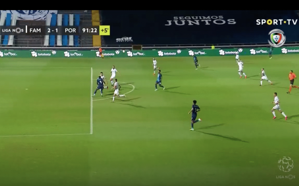 Si à la 74eme minute, Corona égalise pour le FC Porto, Famalicao ne va pas se laisser impressionner et va profiter de la fébrilité de la défense des visiteurs pour reprendre l’avantage. Sur un long une-deux avec Racic, Pedro Gonçalves pénètre dans l’axe central adverse, mais les défenseurs reculent. Il en profite et enroule des 25 mètres un tir qui prend à défaut le gardien qui n’était manifestement pas sur de bons appuis. 2-1.