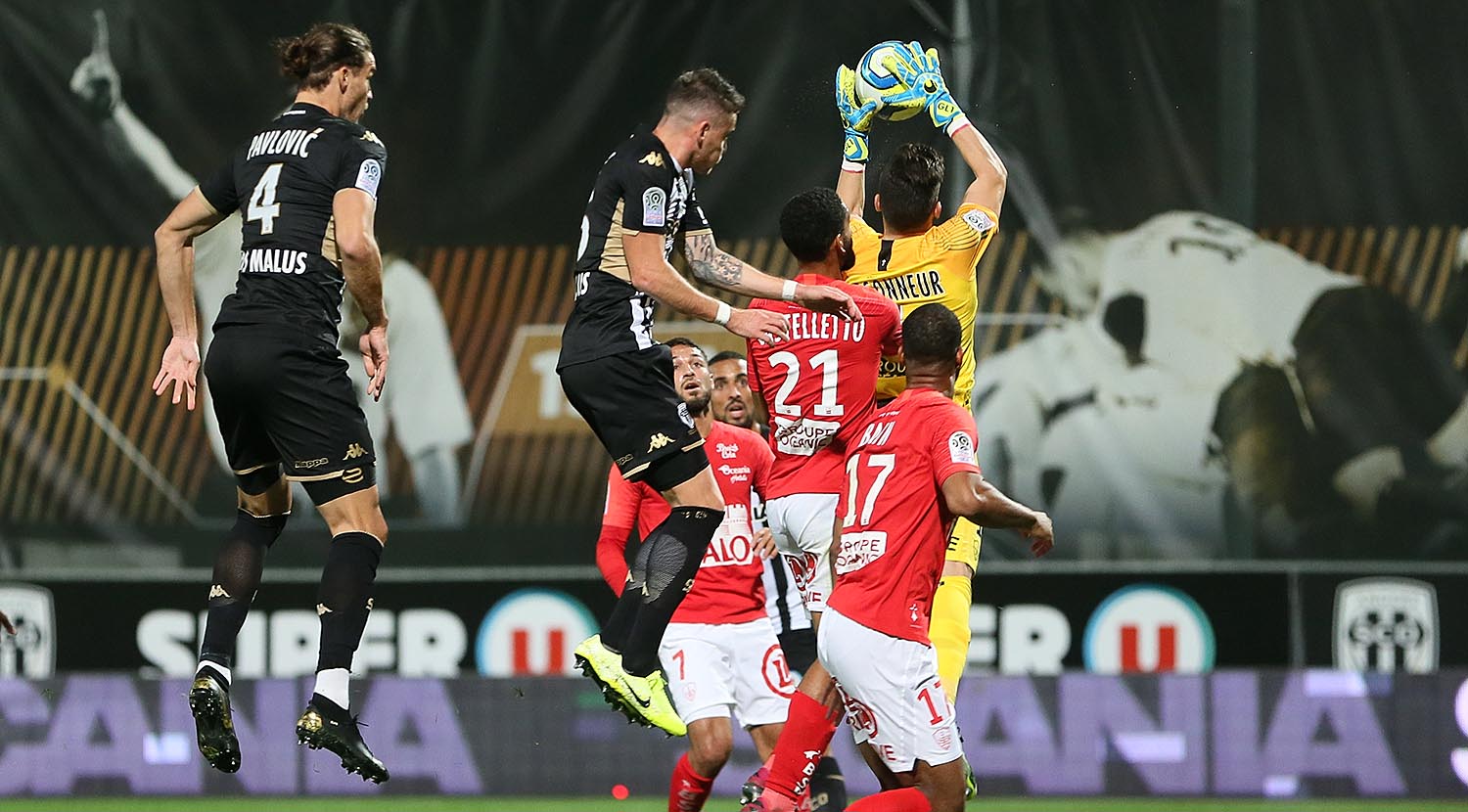 Généreux dans les premiers duels et leurs efforts fournis sur le rectangle vert, les Angevins mettent rapidement le pied sur le ballon. Malgré une combinaison sur corner (10ème), certainement travaillée cette semaine par les Bretons qui surprend un peu les Noirs et Blancs, ils vont progressivement trouver des failles dans le bloc adverse. A droite, Vincent Manceau met de l’effet dans la trajectoire de son ballon, que Mathias Pereira Lage est tout proche de couper en plongeant bille en tête (23ème) ! A 30 mètres du but de Larsonneur, Baptiste Santamaria sent ensuite le souffle des supporters angevins dans son dos, qui l’incite à prendre sa chance. C’est détourné par Castelletto qui aurait pu tromper son propre gardien si celui-ci n’avait pas plongé pour détourner (25ème). Le dernier rempart du Stade Brestois est encore à l’honneur peu avant la demi-heure. Il sort une grosse parade pour aller chercher la puissante frappe de Farid El Melali, totalement démarqué dans la surface (28ème). On insiste, on insiste ! Thomas Mangani remet tout en classe, d’une talonnade, le centre de MPL. Pierrick Capelle peut frapper, il est finalement contré par Castelletto (31ème).