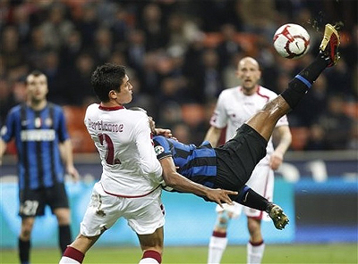 Muet depuis le 20 décembre en Serie A (!), mais sauveur de l’Inter en huitièmes de la C1 contre Chelsea, Samuel Eto’o a été le grand artisan de la victoire milanaise contre Livourne (3-0). Face à la lanterne rouge, l’attaquant camerounais a inscrit un doublé (36e, 41e), et notamment un magnifique retourné acrobatique. Avec Chivu et son casque de protection qu’il doit désormais porter depuis son opération du crâne, l’Inter a fait le spectacle. Motta a réalisé deux passes décisives. Désormais, les hommes de José Mourinho possèdent quatre points d’avance sur l’AC Milan et la Roma.