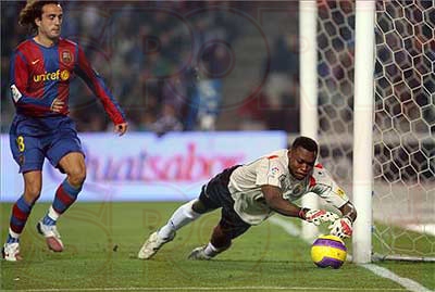 L’international Camerounais du Real Majorque a marqué contre Murcie. Entré à la 62e minute, Webo trouve le chemin des buts 7 minutes plus tard. Un but qui permet à l’équipe de Las Palmas d’obtenir un match nul à domicile. Arrivé sur l’île en provenance de Pampelune, Achille Webo devra observer une pause de 3 mois suite à une fracture du cinquième métatarse du pied droit. Contre le Real Madrid, il avait déjà joué les 15 dernières minutes de la partie. Bonne affaire de l’Espanyol de Kameni qui a tenu tête au FC Barcelone dans le derby catalan. Les protégés de Frank Rijkaard, sans Ronaldinho, une nouvelle fois sur le banc, ont pourtant débuté la partie de manière idéale grâce à un but de Iniesta (6e). Mais, comme face à Lyon (2-2) mercredi en C1, ils se sont ensuite montrés incapables de tenir ce résultat et ont dû céder sur un tir de Carominas (68e).