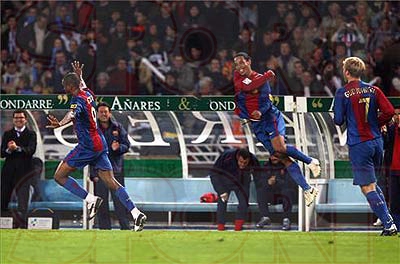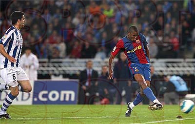Pour mettre fin au suspense, le camerounais allait inscrire le second but, signe de victoire définitive pour son équipe. Un appel de balle fait sur le côté gauche, à la limite du hors jeu, une passe millimétrée de Ronaldinho dans l’espace, la vitesse du camerounais laisse les défenseurs de la Réal sur place, qui va enfin battre Bravo dans un face à face qu’il gagne en faisant montre d’un grand sang froid. Real Sociedad 0, FC Barcelone 2. Le Barça a cinq journées pour remporter son troisième titre d’affilé.