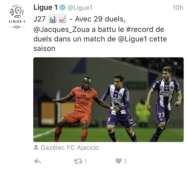 « Avec 29 duels, Jacques Zoua a battu le record de duels dans un match de Ligue 1 », a publié la Ligue 1 sur sa page twitter avec une photo de l’attaquant international camerounais au combat avec deux défenseurs toulousains. Le joueur du Gazélec FC Ajaccio surclasse ainsi tous les attaquants du championnat de France dans la rubrique des duels remportés. Dans les airs comme au sol, il est pour le moment le maître absolu.