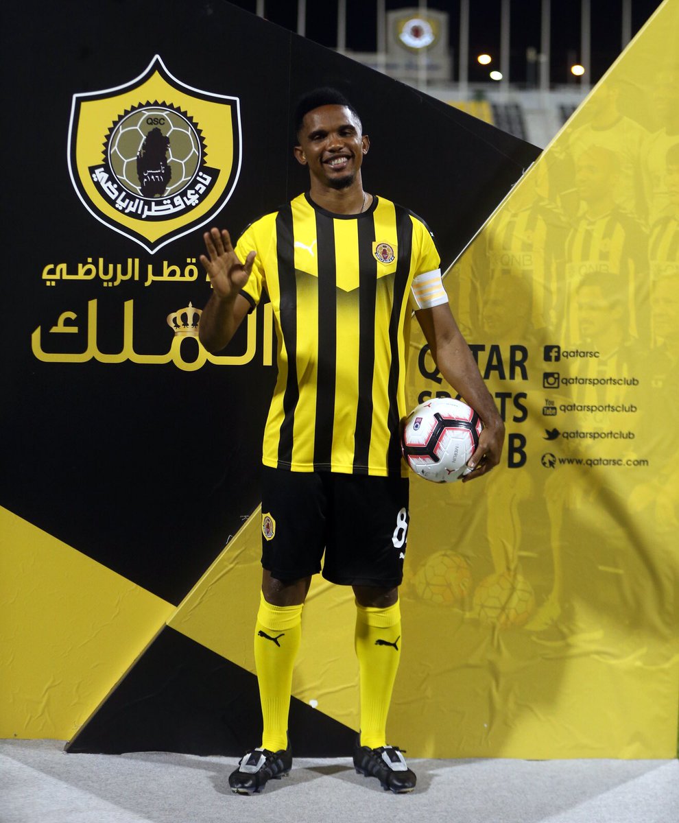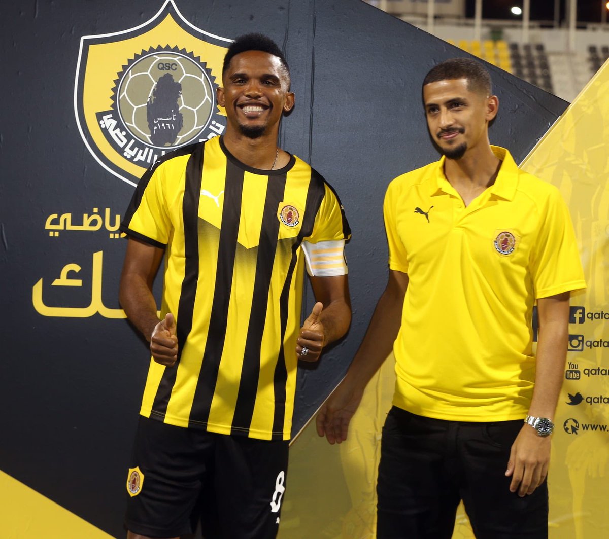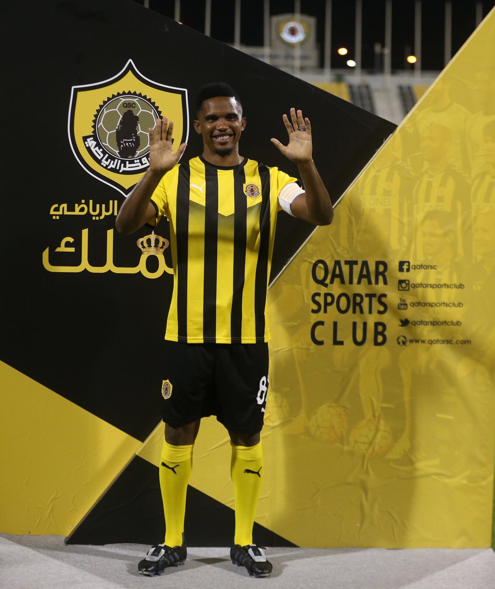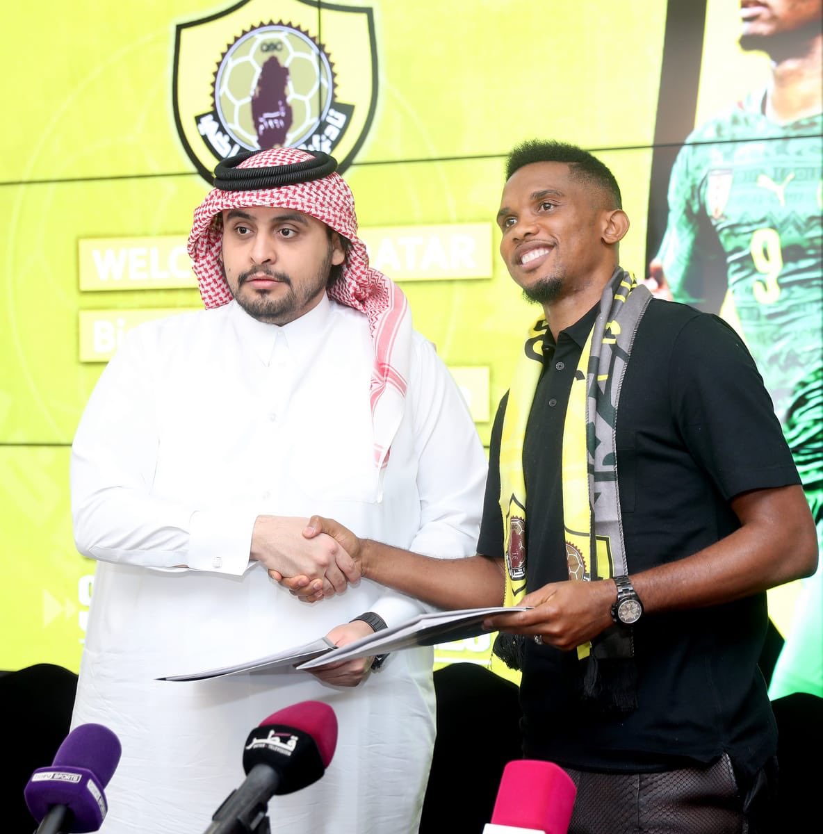 Il est à ses derniers miles dans le football professionnel. L’ex international camerounais Samuel Eto’o a apposé sa signature au bas d’un contrat qui le lie désormais au Qatar Sports Club. La cérémonie d’officialisation a eu lieu ce mardi soir à Doha. Il a aussitôt hérité du brassard de capitaine de l’équipe, un honneur qu’ont tenu à lui faire ses coéquipiers. C’est le président du club lui-même, Son Excellence le Cheikh Jassim Bin Hamad Bin Nasser Al Thani qui a tenu à représenter la partie qatarie.