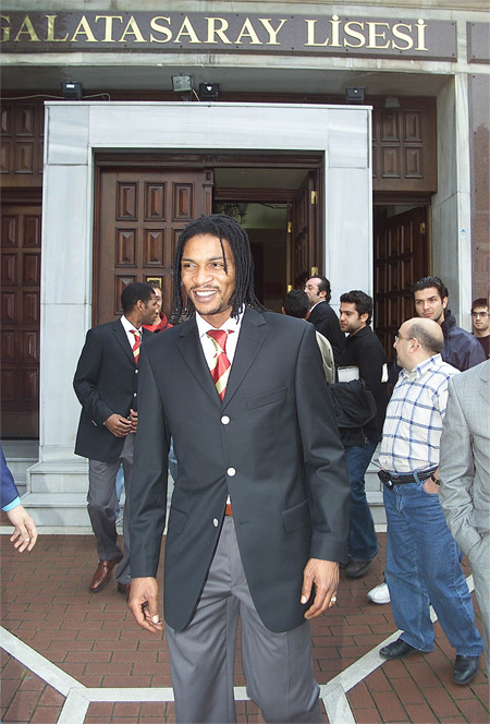 Le Capitaine de l'équipe nationale du Cameroun et ses coéquipiers du club turc devant le Lycée (academie) de Galatasaray.