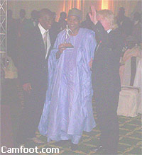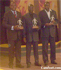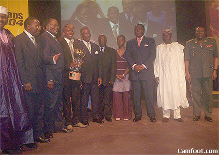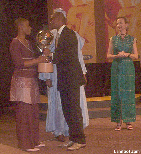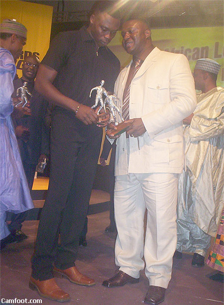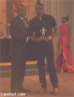 Il a reçu le trophée des mains M. Issa Hayatou, président de la CAF. À gauche, Mme veuve FOÉ qui a reçu une bourse de 2000$ US / mois pour ses 2 enfants.