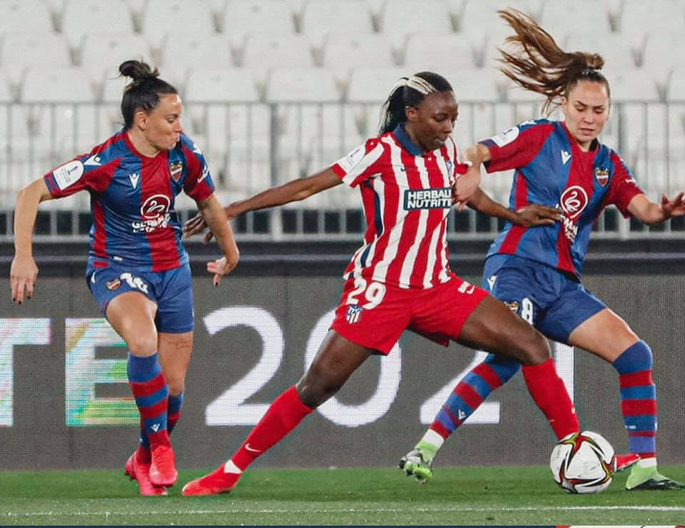 Pour son premier match en Espagne avec Atletico Madrid Femenino, l’internationale Camerounaise a fait sauter la poudre d’escampette. Titularisé d’entrée, c’est elle qui a conduit son équipe à la victoire dans cette rencontre qui fut palpitante contre Levante. Technique, rapide, puissante, intelligente, elle a fait parler sa panoplie. C’est d’abord à la 18e minute qu’elle percute sur l’aile gauche, centre et trouve sa coéquipière Deyna dans les six mètres pour le premier but de la rencontre.