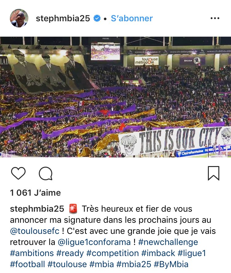 L’ancien capitaine des Lions indomptables du Cameroun a annoncé, via son compte Instagram, qu’il va s’engager dans les prochains jours avec le club français de Ligue 1, Toulouse FC. Cette annonce clarifie ainsi les choses puisque les rumeurs envoyaient Mbia aux quatre coins du monde. Ce sera un retour en France, le pays qui l’a révélé, avant son transfert en Angleterre, aux Qeens Park Rangers.