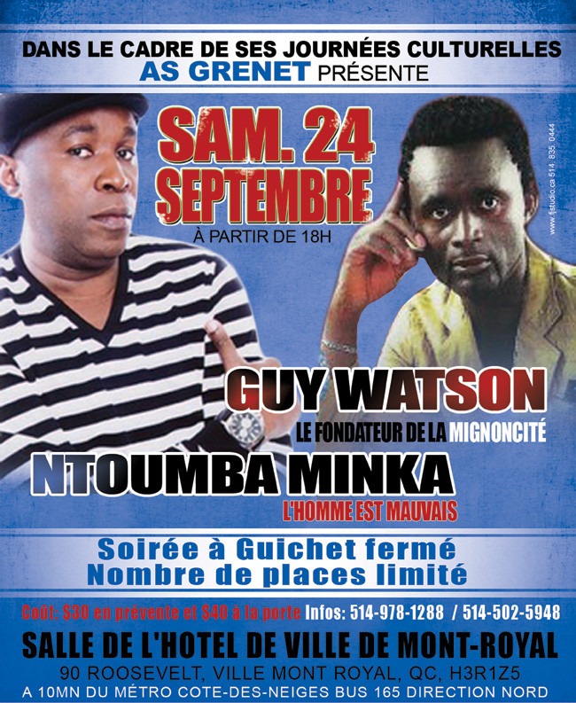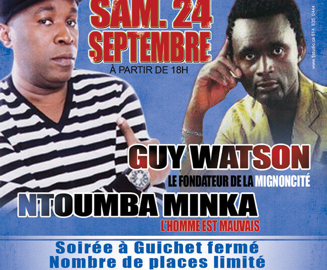 Soirée électrisante à Montréal. Ce samedi 24 Septembre, la métropole va vibrer. L’été sera de retour. Ntoumba Minka, que l’on ne presente plus et Guy watson, le fondateur de la Mignoncité seront réunis sur le même plateau. Tout ça dans la célèbre salle de réception de la Mairie de Mont Royal. La soirée sera à guichet fermée. Pas de vente au guichet. Alors… ça va chauffer !!